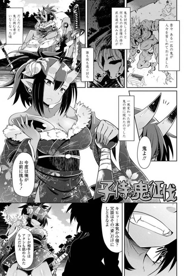 【エロ漫画】ずっと人々を苦しめ続ける巨乳鬼娘…そこに戦いを申し込んできたのは小指ほどの小人ショタ侍だ...