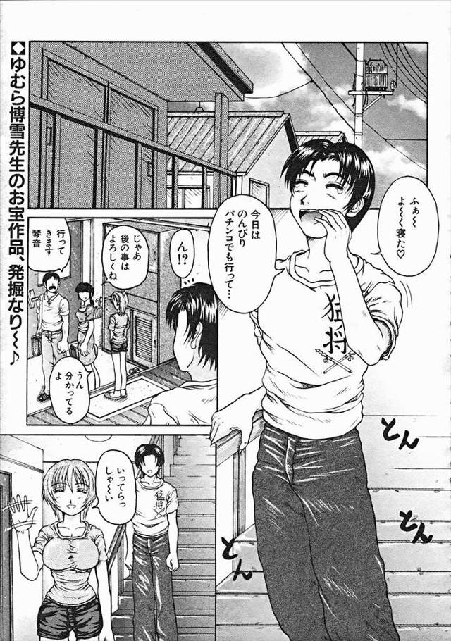 【エロ漫画】向かいの浪人生に噂の真相を確かめられる巨乳人妻…夫に黙っていてくれることを条件に不倫セックスをする!【友永ケンジ】